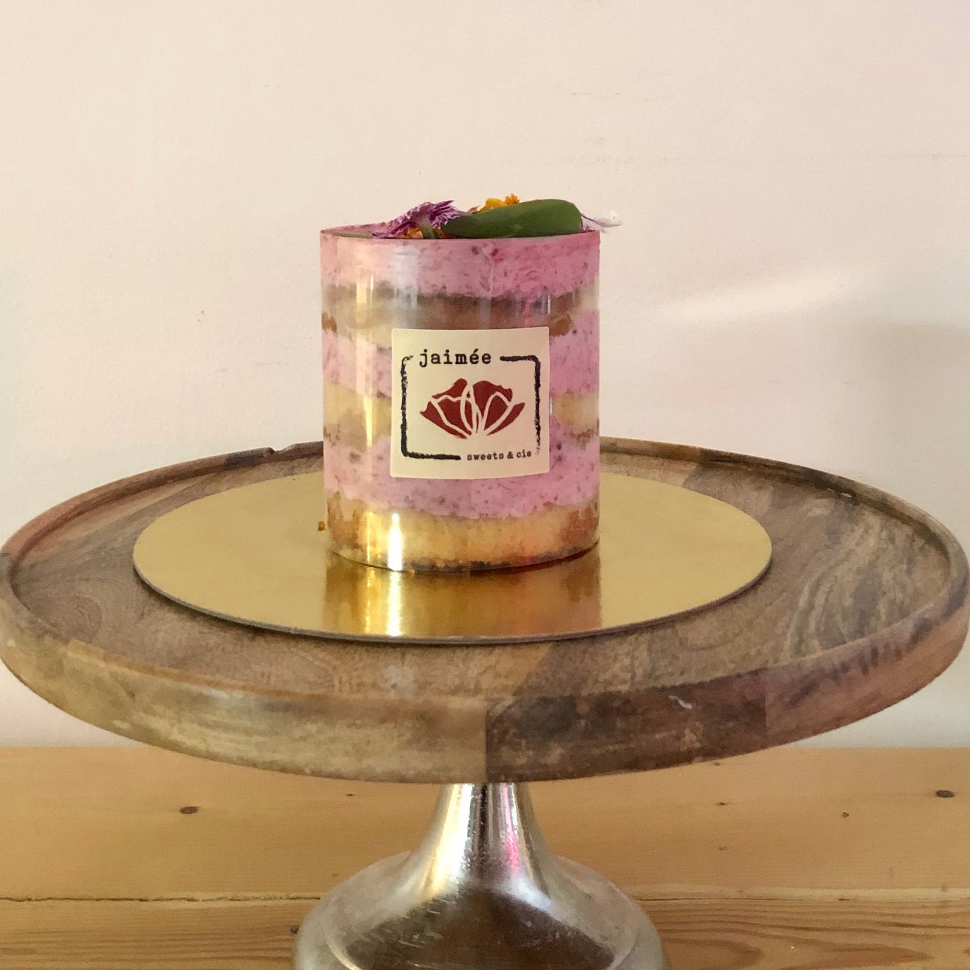Chaque niveau raconte une histoire de textures : génoise moelleuse, crème chantilly labneh signature Jaimée, compote de fruits ou praliné selon l’inspiration du moment.