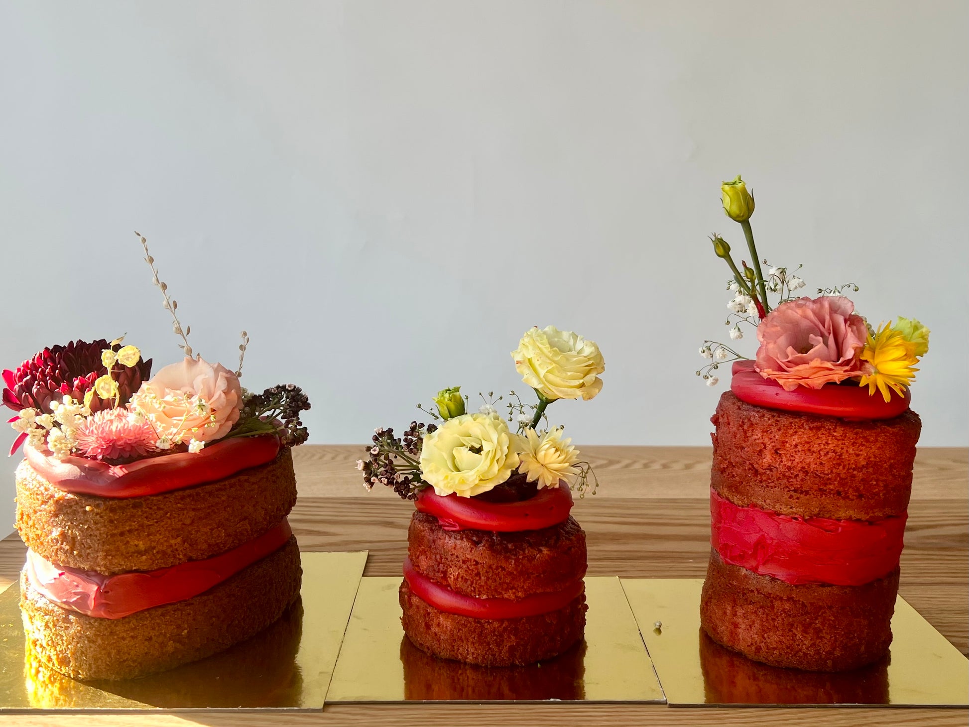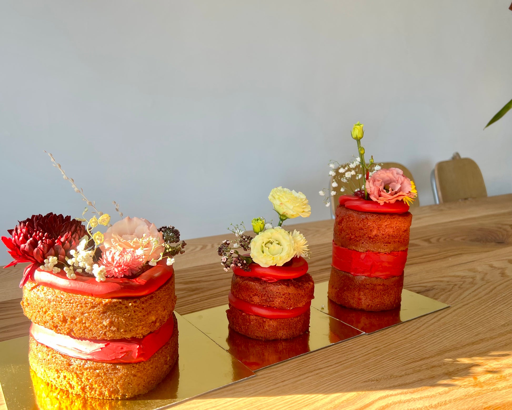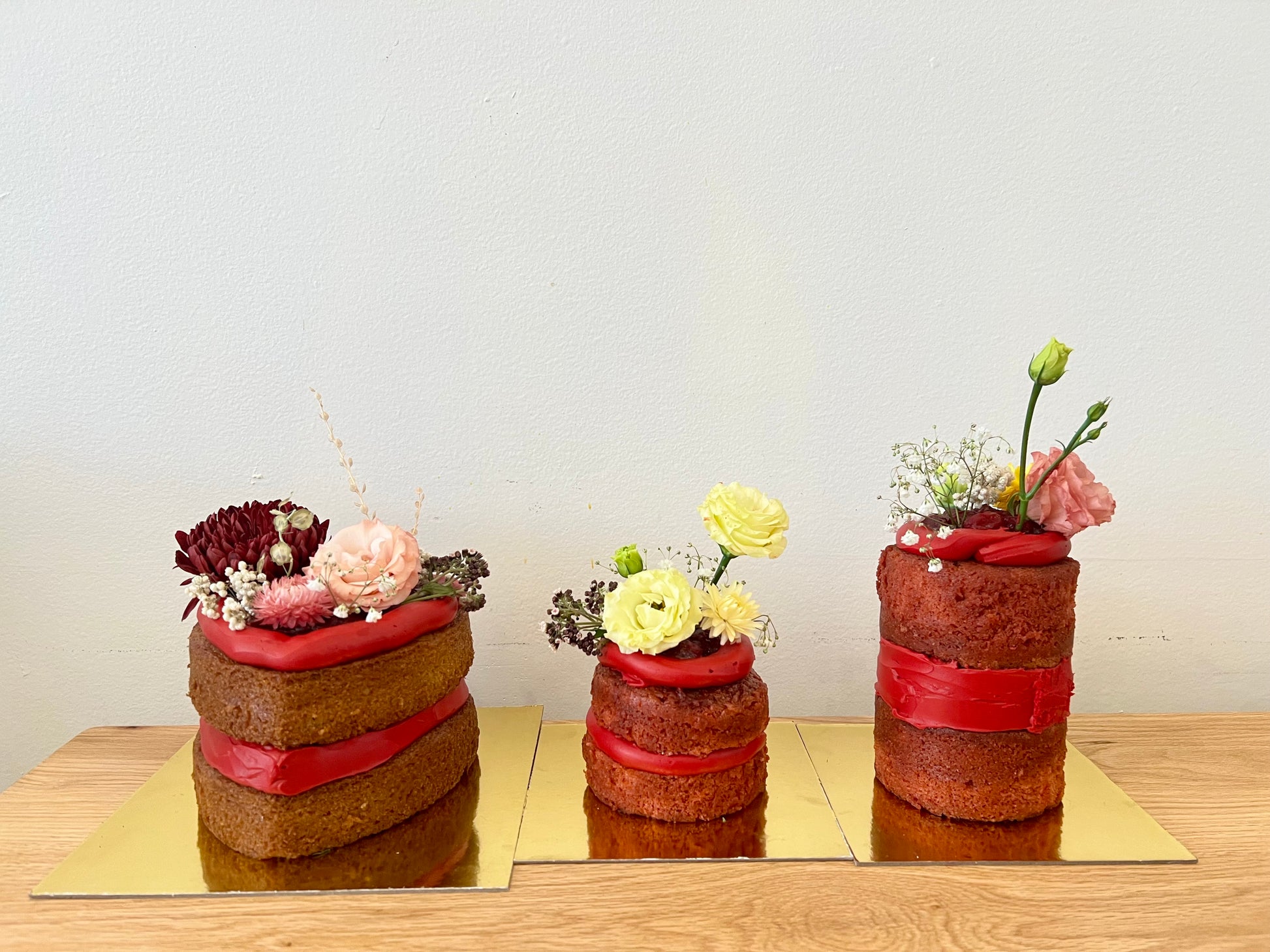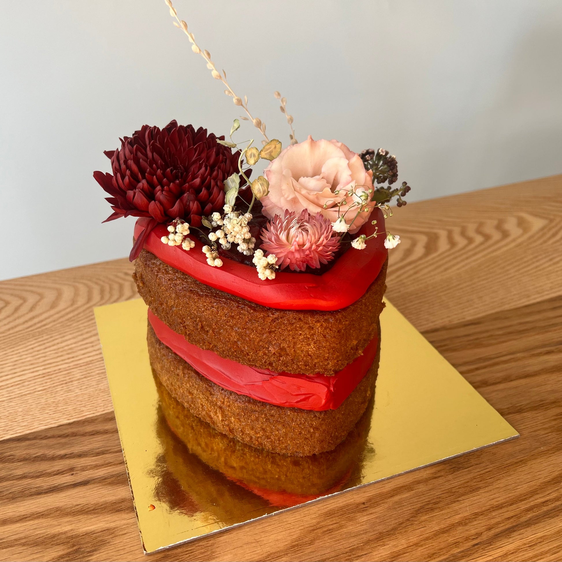 Composé de couches de gâteau moelleux, garnies de crème au beurre soyeuse et de compotée de fruits rouge vif, il est délicatement fini avec un glaçage minimal laissant apparaître la mie. Chaque gâteau est décoré de fleurs fraîches de saison, choisies selon l’inspiration du moment.