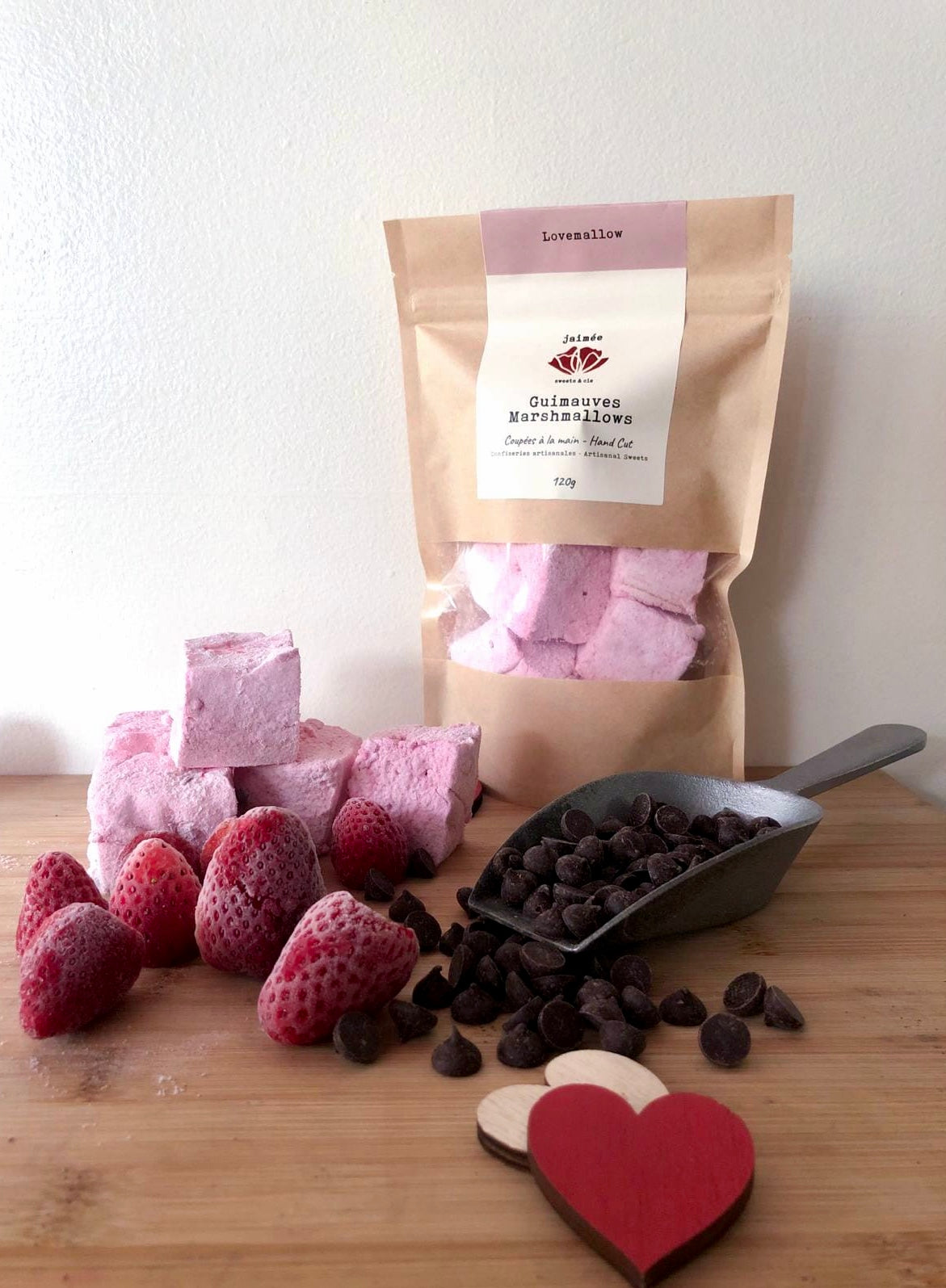 Ingrédients: sucre*, miel, gélatine*, pépites de chocolat 70%*, sucre à glacer, fécule de maïs, essence de fraise naturelle, poudre de betterave*, sel rose de l'Himalaya.